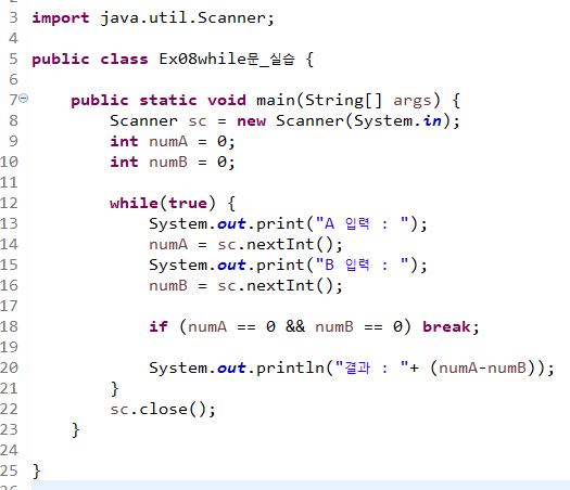 while문 예시2 - A와 B를 입력하여 A, B가 0일때 break 0이 아닐때 A-B 출력