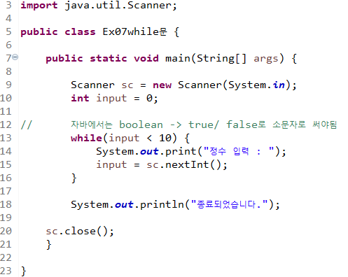 while문 예시1 - 정수를 입력하여 정수가 10이상일 경우 종료