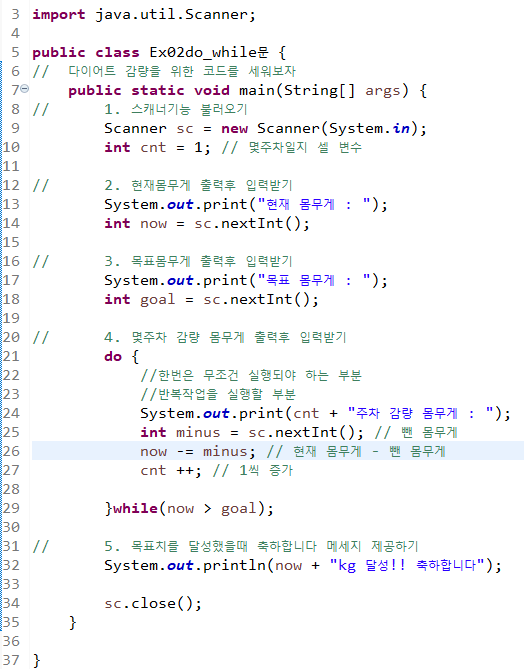 }while(조건식); // 조건식이 true일 경우 실행문장 반복, false일 경우 do-while문을 빠져나옴